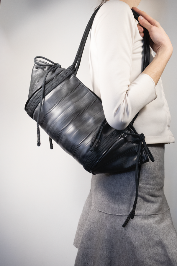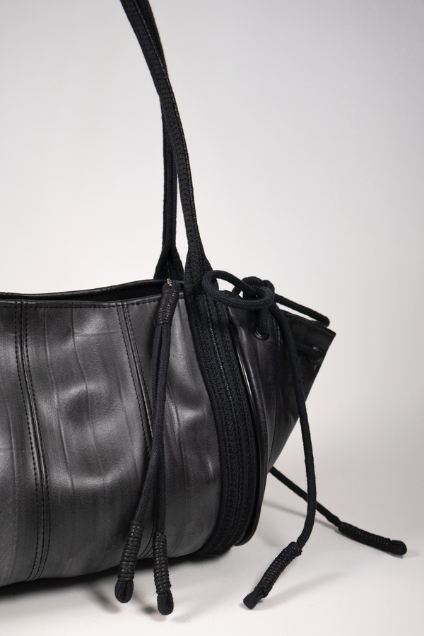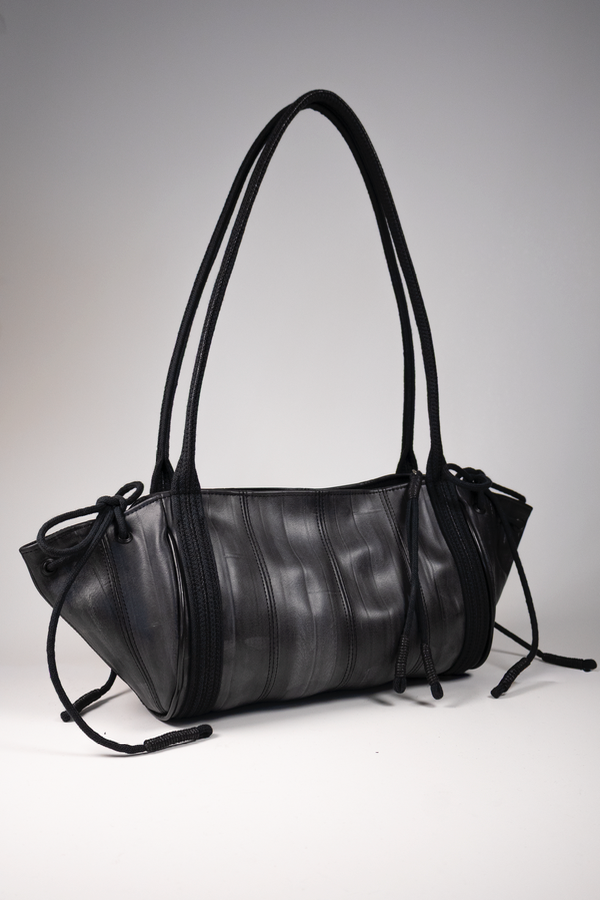 Cartera de hombro hecha con caucho recuperado de cámaras de bicicleta descartadas.