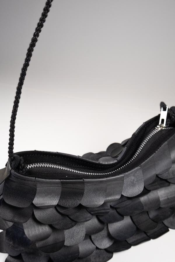carterita pequeña, puede usarse al hombro o cruzada ya que la correa se regula. exterior confeccionado con módulos de caucho, recuperado de camaras de bicicleta. interior forrado en gabardina de algodón negra.